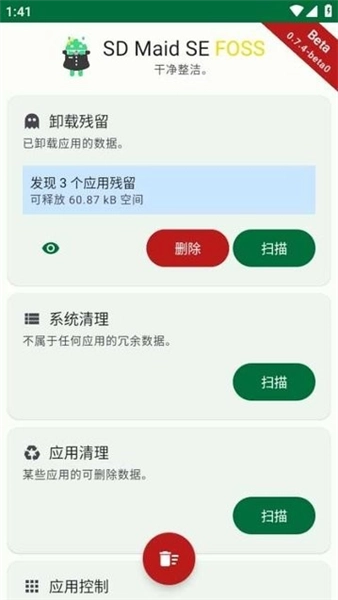 sdmaidse清理器的最新版本是一款十分实用的手机清理工具。借助这款软件,用户能够清楚掌握手机内存的占用状况,还能从卸载残留、系统清理、应用清理等多个维度对手机内存进行清理,让手机运行得更加流畅,进而延长其使用寿命。此外,用户可以预先对软件的运行模式进行设置,授予相应权限并明确标注哪些数据不允许清理,之后软件就会自动清理掉那些用户不需要的数据垃圾。有需求的朋友们赶紧来体验吧!
