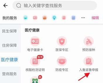 进入医疗健康,找到点击下方的入鲁返鲁申报进入