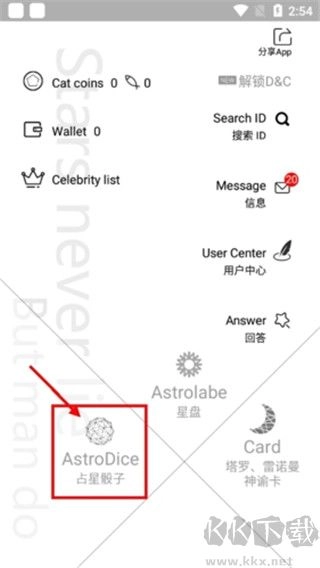 1、占星猫登录后具备占卜自身运势等功能,在软件主页面中选择左下角的“占星骰子”即可使用相关功能。
