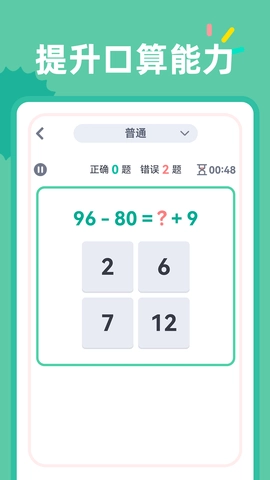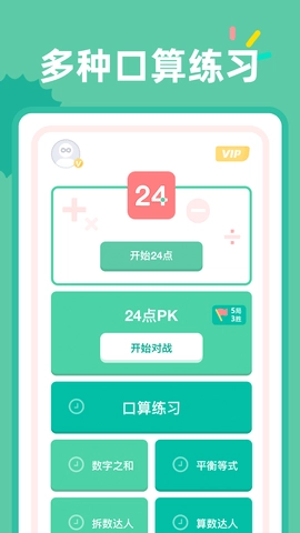 24点口算是由绍兴乐真网络科技有限公司开发的一款手机计算器软件,主要用途是辅助用户开展口算练习以及解决各类算术问题。该软件具备丰富多样的功能与玩法,能够助力用户增强口算能力,同时促进智力的发展。【24点口算】设有三种不同的模式,分别是简单练习、经典练习和竞速练习。其中,简单练习模式仅涵盖加法与减法运算,十分适合初学者进行基础层面的练习;经典练习模式则提供了数量庞大的题目资源,用户可以依据自身的实际需求,自由选择进行练习或挑战;而竞速练习模式会将时间限制在3分钟内,用户需要在这规定的时间里尽可能多地完成题目,以此来展现自己的口算速度与能力。