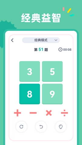 在【24点】模式里,用户得运用加、减、乘、除这四种运算方式,把给出的四个正整数计算出结果24。每个数字都得用一次,并且只能用一次。题目的难易程度不一样,有的题目很容易就能解出来,有的题目则需要一些技巧和思考。要是用户解不出来,可以点击提示来获取解题思路。如果计算错了,用户可以返回上一步或者重置这道题,方便用户进行调整和改正。
