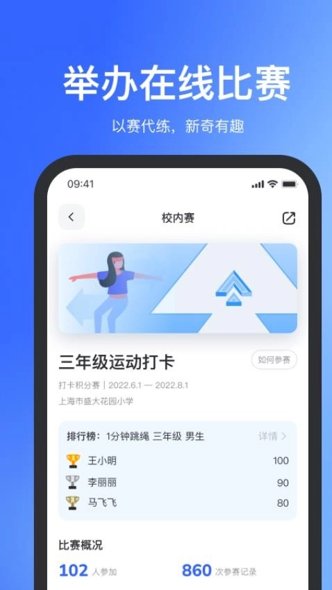 用比赛代替训练,助力提升体育成绩;趣味十足,带来智能互动的全新体验;便捷高效,无论何时何地都能参与竞赛!