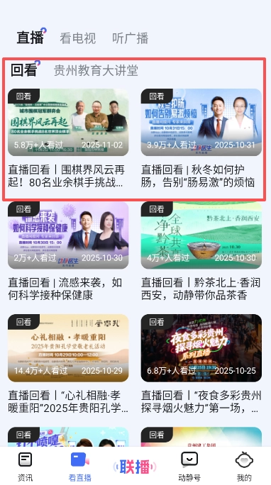 1、空中黔课网课平台的直播回看内容,会集中展示在底部的看直播功能栏页面中。