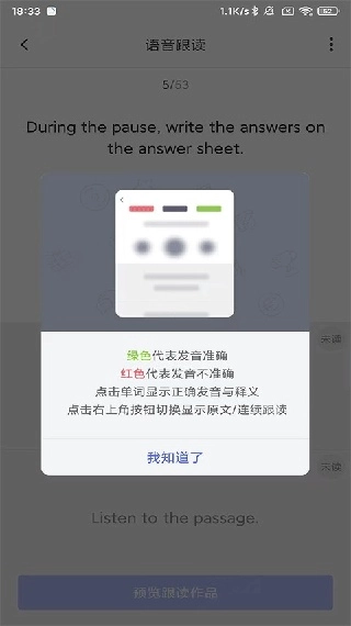 系统会通过颜色标识来提示发音的准确程度,其中绿色代表发音准确无误,红色则说明发音存在偏差。在查看完这些标识后,请点击【我知道了】按钮。