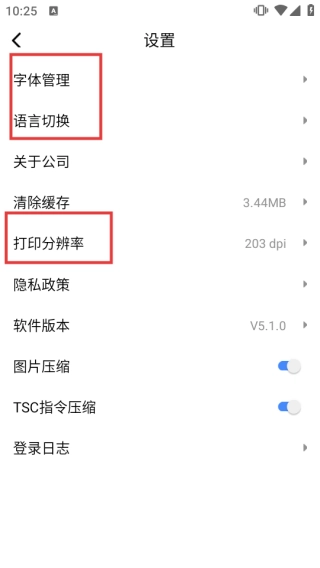 在设置界面中,能够对【字体管理】【语言切换】【打印分辨率】等选项进行调整与配置,以此满足用户个性化的打印需求。