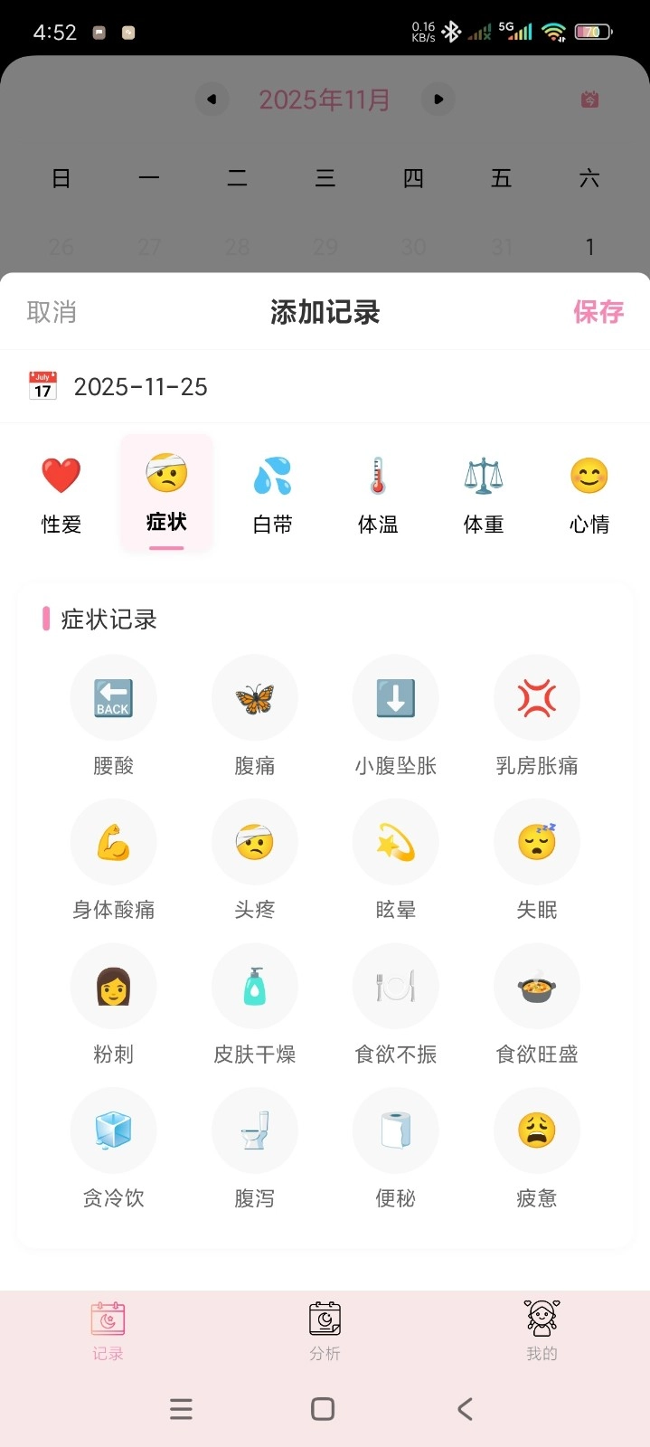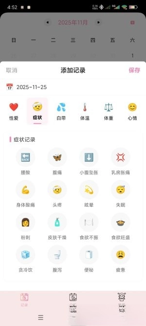 花期不仅能记录经期的起止时间,还可以填写经量多少、痛经程度、身体的不适感以及当天的心情状态,让经期记录更贴合实际情况,便于长期追踪身体的变化。
