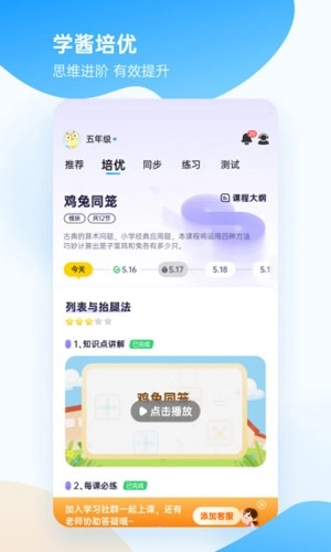 学酱的研究型“人文”产品团队,深入探究教育心理学所揭示的小学生认知规律,细致剖析小学阶段孩子需应对的各类任务,构建起高效培优、趣味数学、优学题库、同步课堂、模拟测试五大功能板块,通过激发学习兴趣、推动互动参与、深化成就体验,助力孩子实现并稳固“学霸”水平。