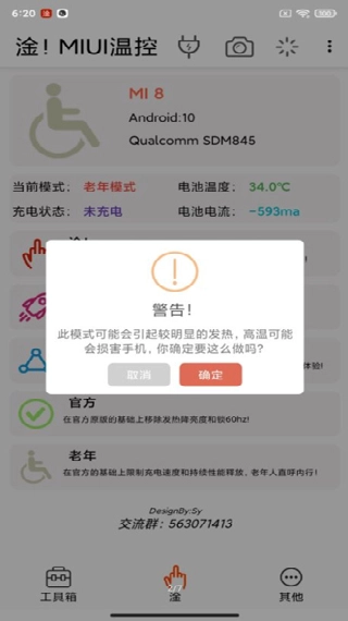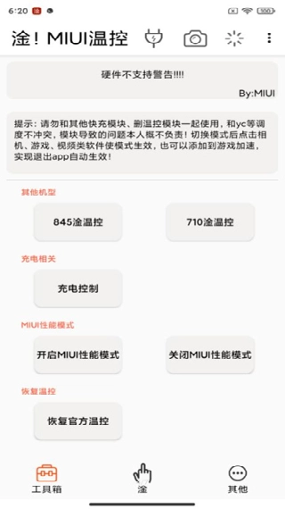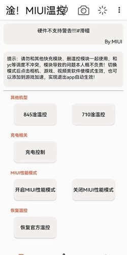 进入工具箱界面后,能够查看其他机型的“温控”功能、充电控制选项、MIUI性能模式的开启与关闭操作,还有恢复温控的功能入口。