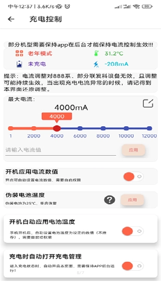 充电控制功能能够对手机充电过程中的最大电流进行调节,并且还为用户提供了其他与电池相关的功能选项。