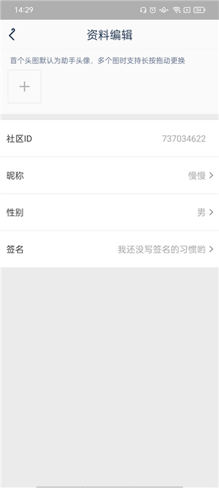2、点击右下角的“主页”按钮,找到页面中的“+”号图标,即可进入账号信息编辑界面,在此可以修改头像、昵称、性别、个性签名等个人资料。