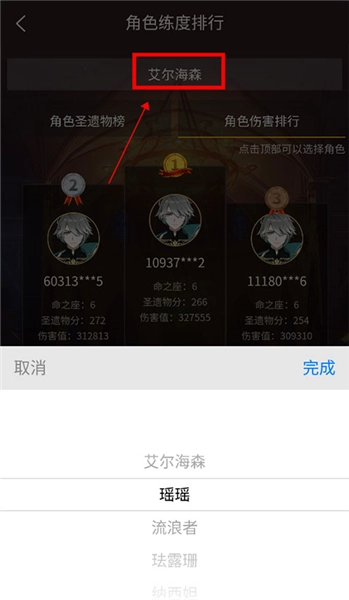 然后从上方的角色圣遗物榜切换到伤害榜,点击顶部的名称可以选择不同的角色进行查看。