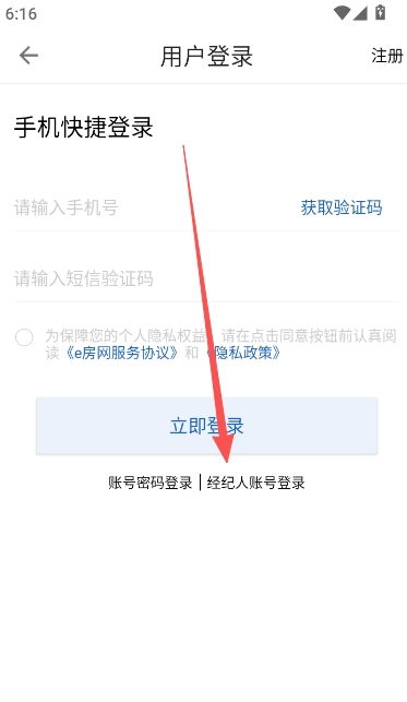 1、进入e房网的用户登录界面后,找到页面下方的经纪人账号登录入口。