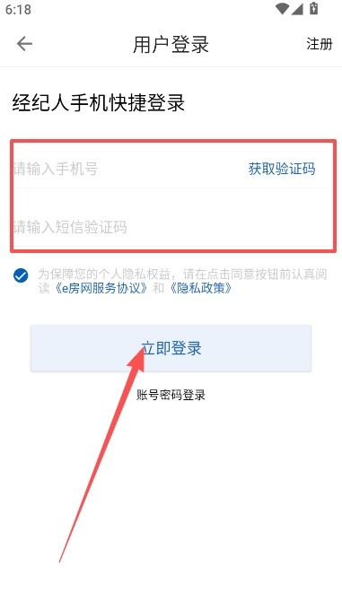 2、通过此前注册时使用的经纪人手机号码,并输入对应的短信验证码即可进入。