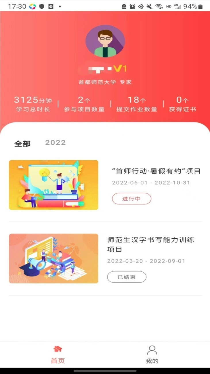 点击右下角的“我的”,即可查看个人学习时长、参与项目、作业提交等数据统计情况。