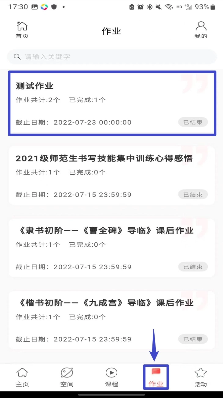 返回底部菜单栏后点击作业选项,即可查看各项作业的详细信息、截止日期以及完成情况。