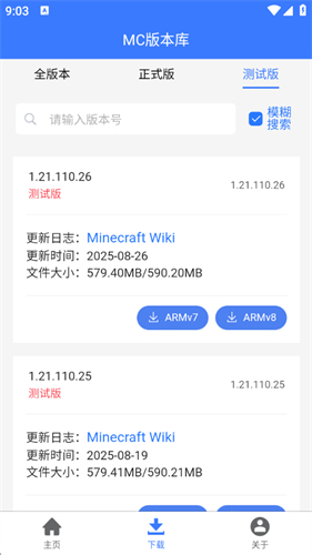 1、MC版本库app测试功能支持,帮助提前体验新功能,能够下载测试版与开发版,感受未来版本的变化。