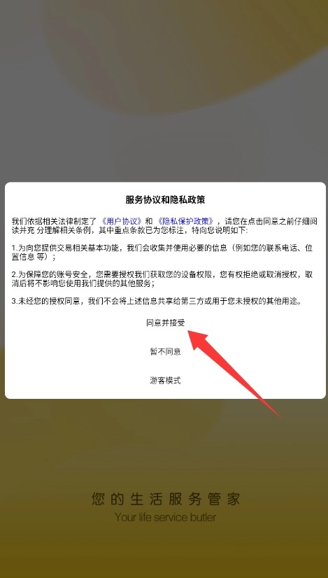 首次打开应用时,需仔细阅读服务条款,点击“同意并继续”按钮后,即可进入主操作界面。