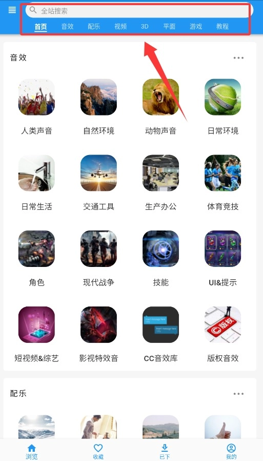 启动应用后,在首页顶部的检索框中输入关键词,系统便会自动匹配出相关的素材资源列表。