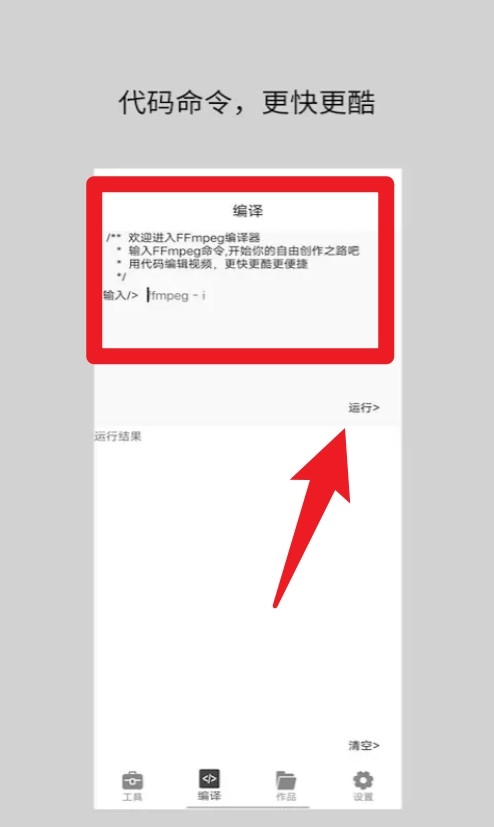 切换到编译标签页,输入FFmpeg指令后点击运行按钮,就能快速完成高级视频操作。