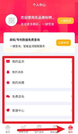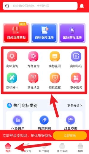 进入首页后,能看到商标查询、专利查询、商标监测等多个功能模块,点击任意一个图标就能使用对应的服务。