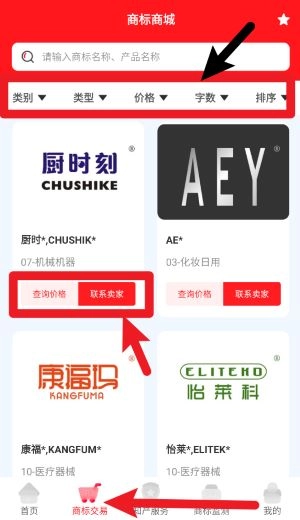 在商标交易页面,您可以借助筛选条件来查找目标商标,点击“查询价格”或“联系卖家”即可快速获取相关交易信息。