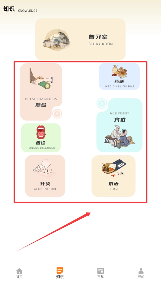 4、查看各类知识就点底部“知识”选项,页面里有脉诊、舌诊等分类图标,点击图标就能学习详细内容。