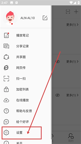 展开菜单后找到【设置】选项并点击,即可进入应用的设置页面,调整播放、传输等相关参数。