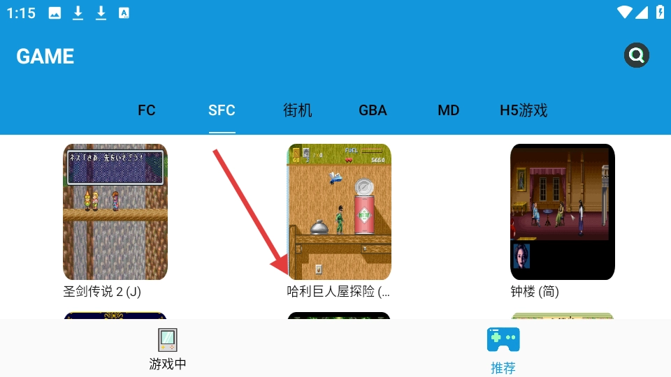 2、在推荐页面的SFC分类板块中,找到并点击《哈利巨人屋探险》这款游戏,即可进入游戏界面。