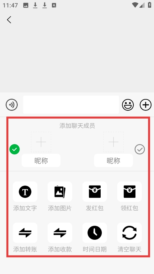 4、这时可以利用添加聊天成员、添加文字、添加图片、发送红包等功能,依据实际需求来制作单人聊天截图。