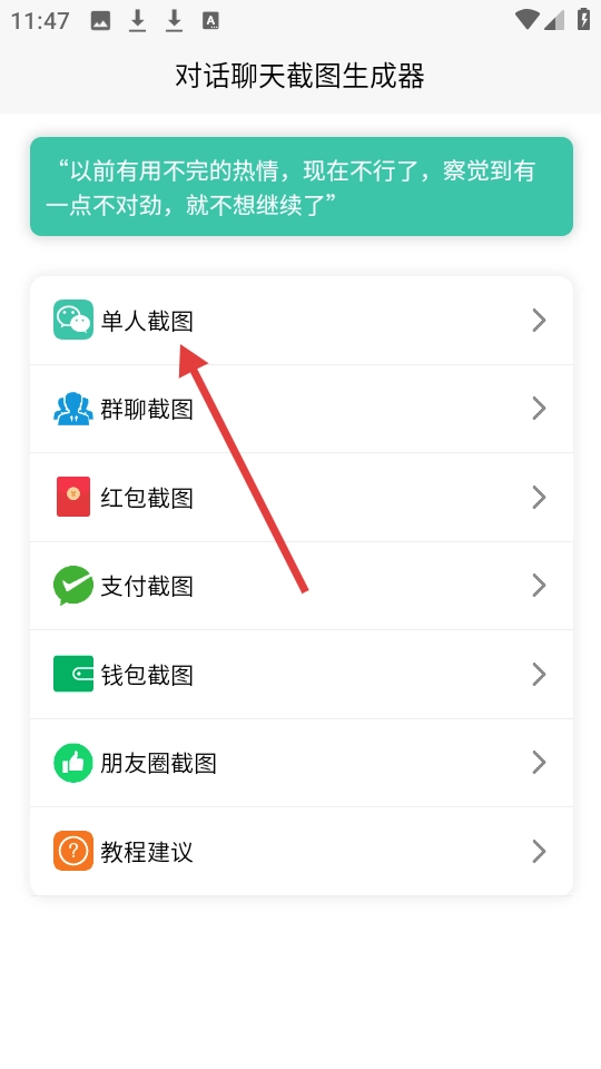 2、进入“对话聊天截图生成器”的主界面后,点击【单人截图】这个选项。