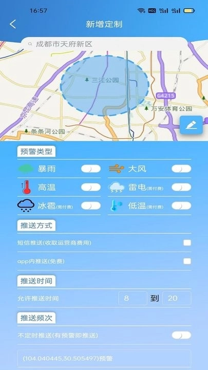 心情地图依托位置信息,能够查看周边的天气实况、预测及预警信息,借助精细化气象格点实况与精细化气象格点实况预报等数据,开展监测、预测、预警及评估工作;通过大数据分析手段,对模式预报数据和用户发布的天气数据进行再次融合分析,从而在时间与空间维度上获取更为精准的预报结果。