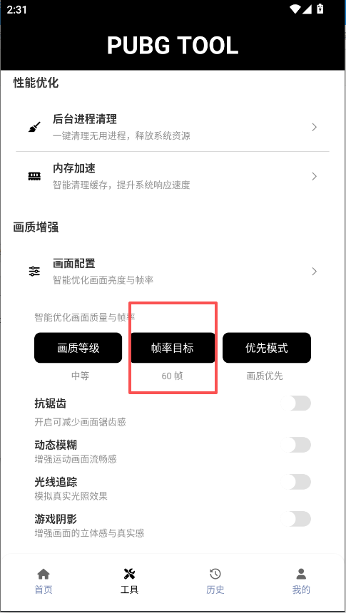 2、点击首页的【解锁画质帧率】,