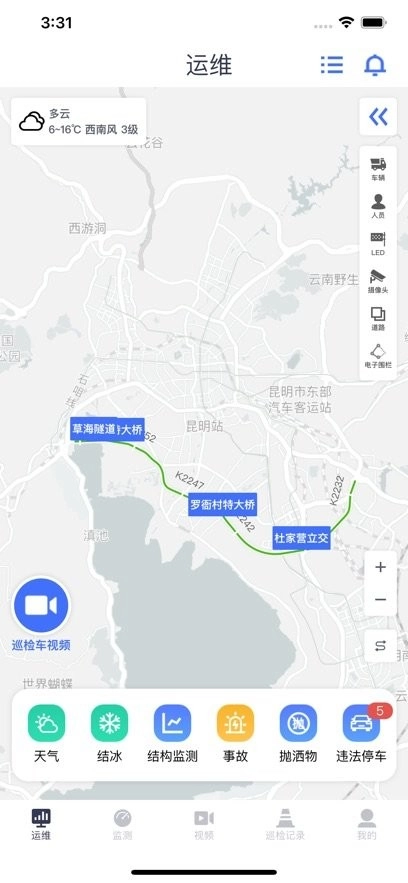 这是昆明路网监控平台,能实时监控路面状况,便于我们掌握车流量情况、隧道内的情况等,还可以及时为我们提供路况、温度、湿度以及道路结冰等数据。