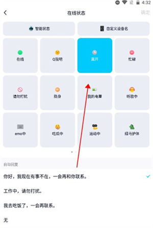 6、选择离开状态后,能看到下面可以设置自动回复,如下图所示;