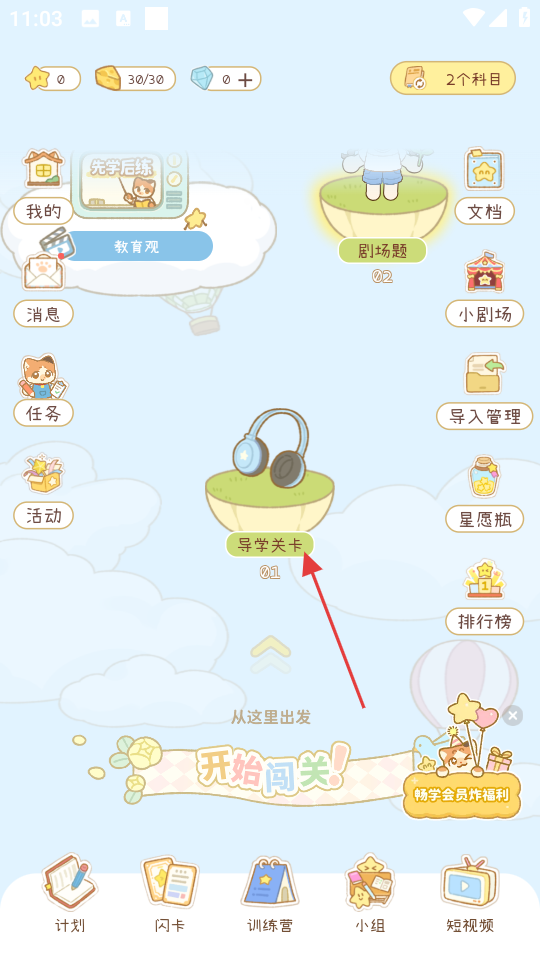 1. 打开Tiku,点击“导学关卡”,进入与教育观有关的页面。