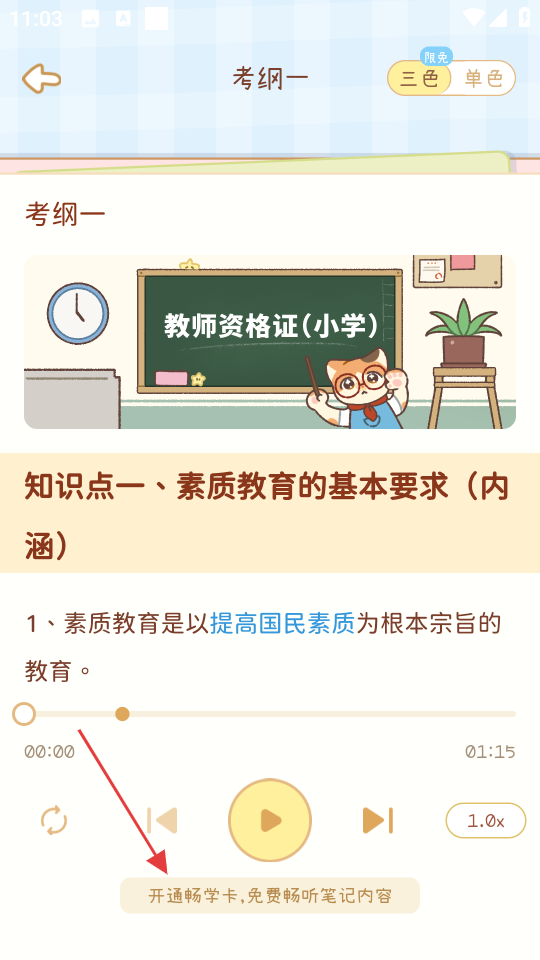 3、在考纲一知识点页面,点击开通畅学卡内容,进入畅学卡开通相关弹窗。