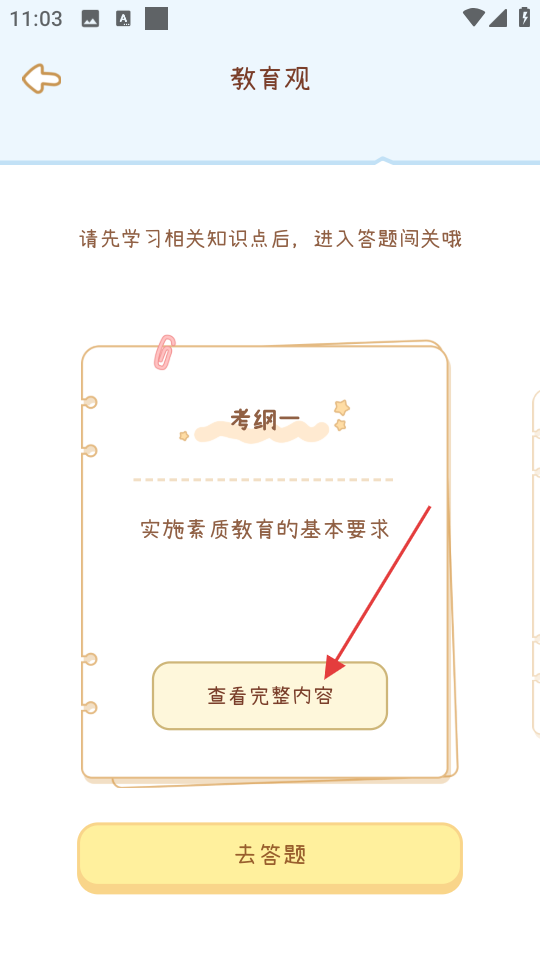 2. 在教育观页面,点击“查看完整内容”,查看考纲一的全部知识点。