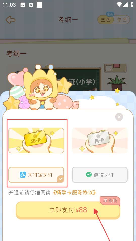 4、于弹窗内,挑选年卡和支付宝支付套餐,点击“立即支付88”,完成畅学卡的支付开通操作。