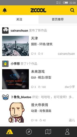 与站酷平台同步更新首页展示的优秀设计创意内容,实时查看好友动态如:发布新作、推荐以及评论。
