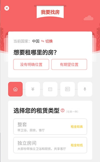 点击我要找房,选择租房位置,选择租房类型;