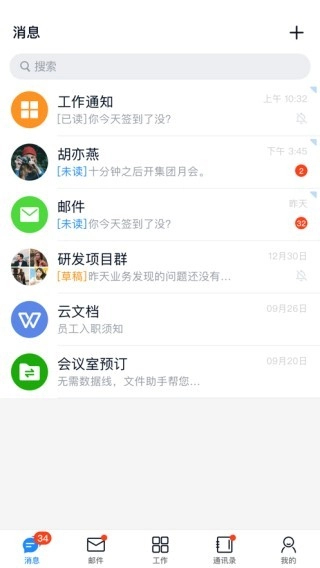 提供企业通讯录功能,能帮助用户快速查找公司全体员工,还支持组建工作小组和创建沟通群组。