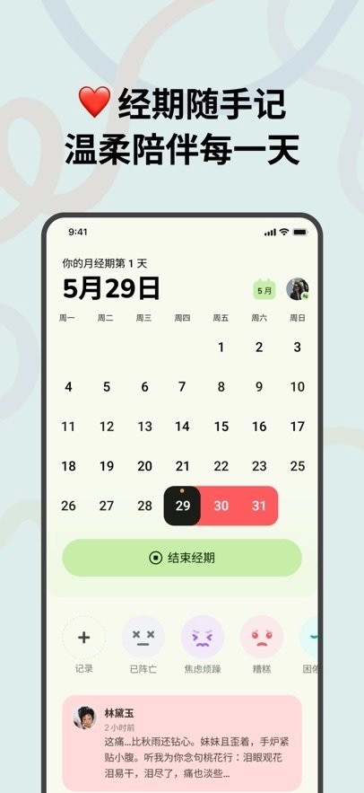 软件为用户提供了线上经期记录功能,便于用户随时记录自身的经期症状与痛经状况。