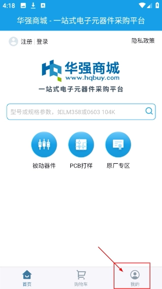 1、打开【华强商城】首页后,点击页面底部的【我的】按钮,即可进入个人相关操作界面。