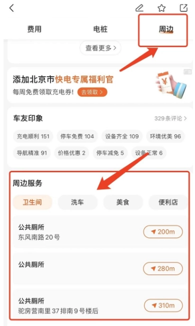 3.你还能通过【选择充电场站-点击周边】这一操作,查询到周边的服务设施。