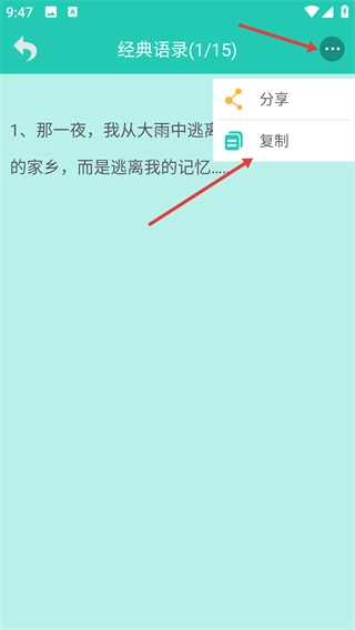4、进入语录详情页面后,点击右上角的更多按钮,接着点击“复制”按钮,即可完成复制操作。