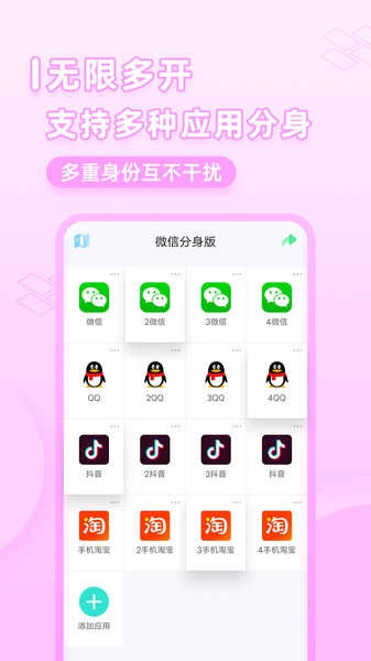 :为每个分身独立设置图标、名称,一键添加至桌面,支持自定义快捷入口,让不同身份的应用一目了然、即点即用。智能应用伪装
