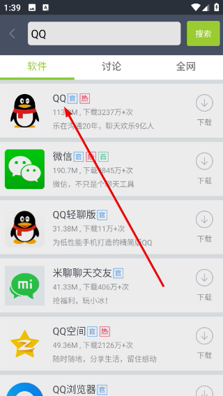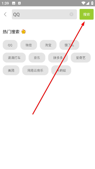 2、在搜索页面的输入框中填入“QQ”,随后点击“搜索”按钮,以此得到相关应用的搜索结果。