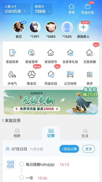 【爱家服务】水电气欠费自动提醒、家庭成员号码统一管理、NFC公交充值一键唤起;