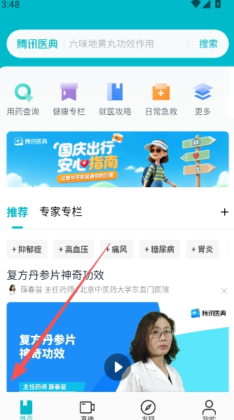 1、首页,为用户提供用药查询、健康专栏、就医攻略、日常急救等医疗知识内容。