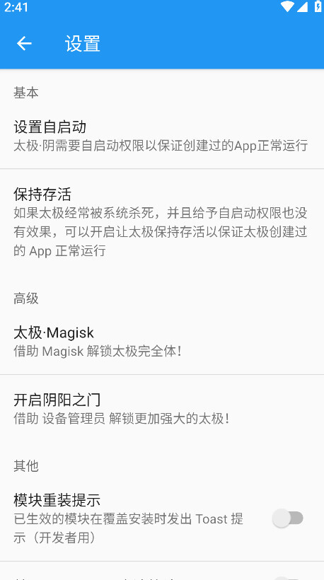 太极观山听雨是一款无需root权限即可rag用户在手机加载Xposed模块的安卓系统增强软件,在这里能够让用户可以一键解锁手机的各种隐藏功能让你来使用,帮助你可以在线体验不同的手机测试。更可以支持应用多开,定位修改等功能哦。